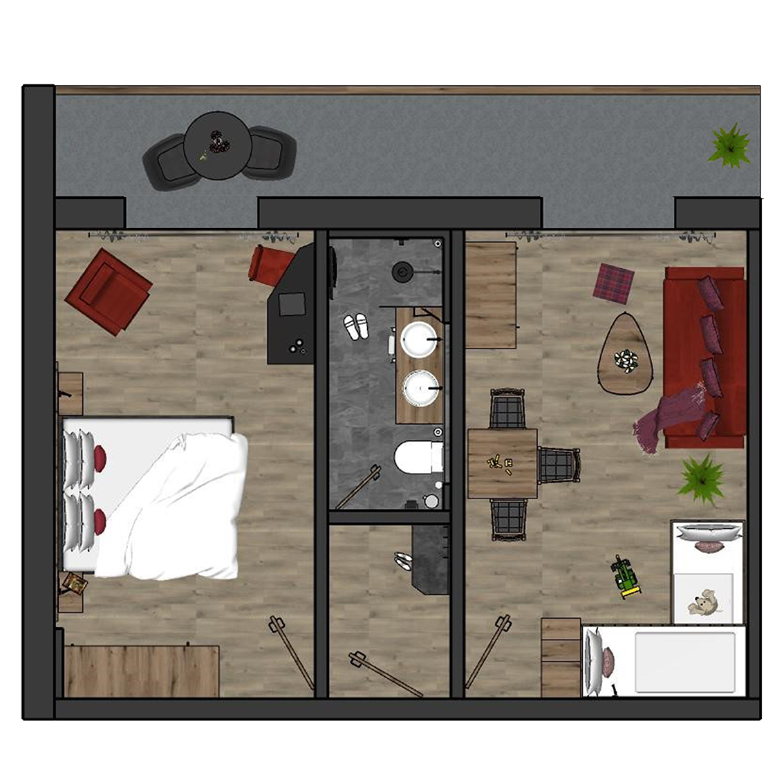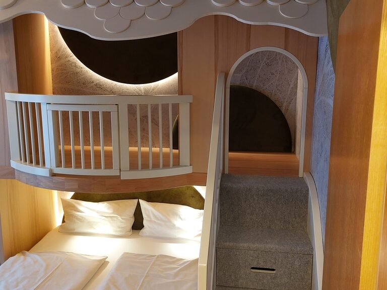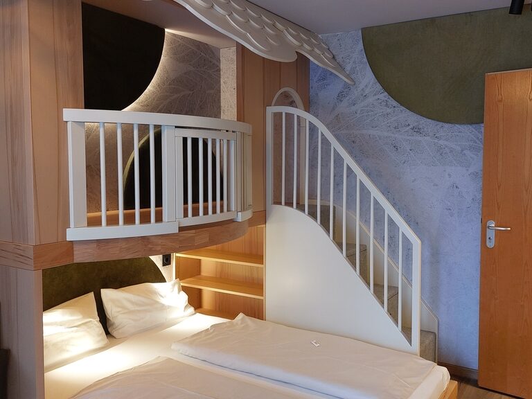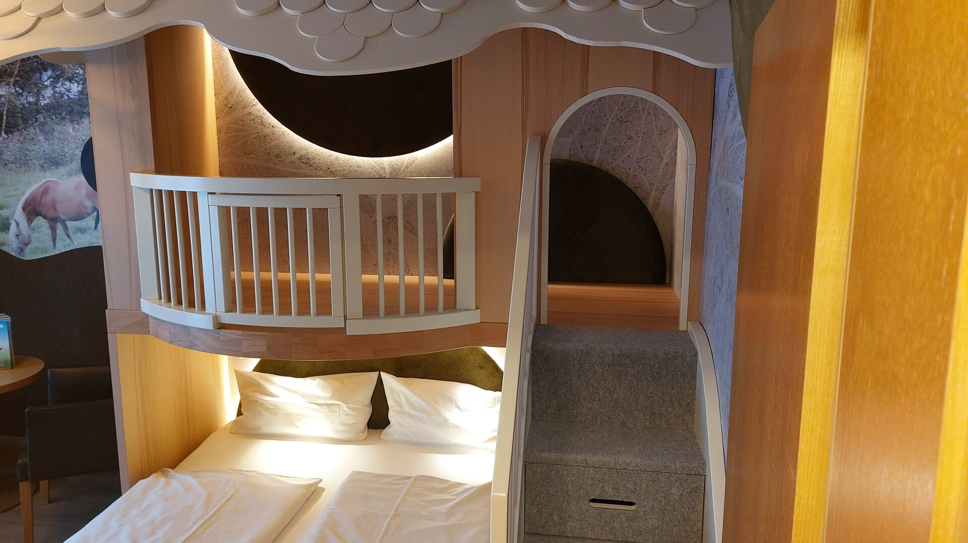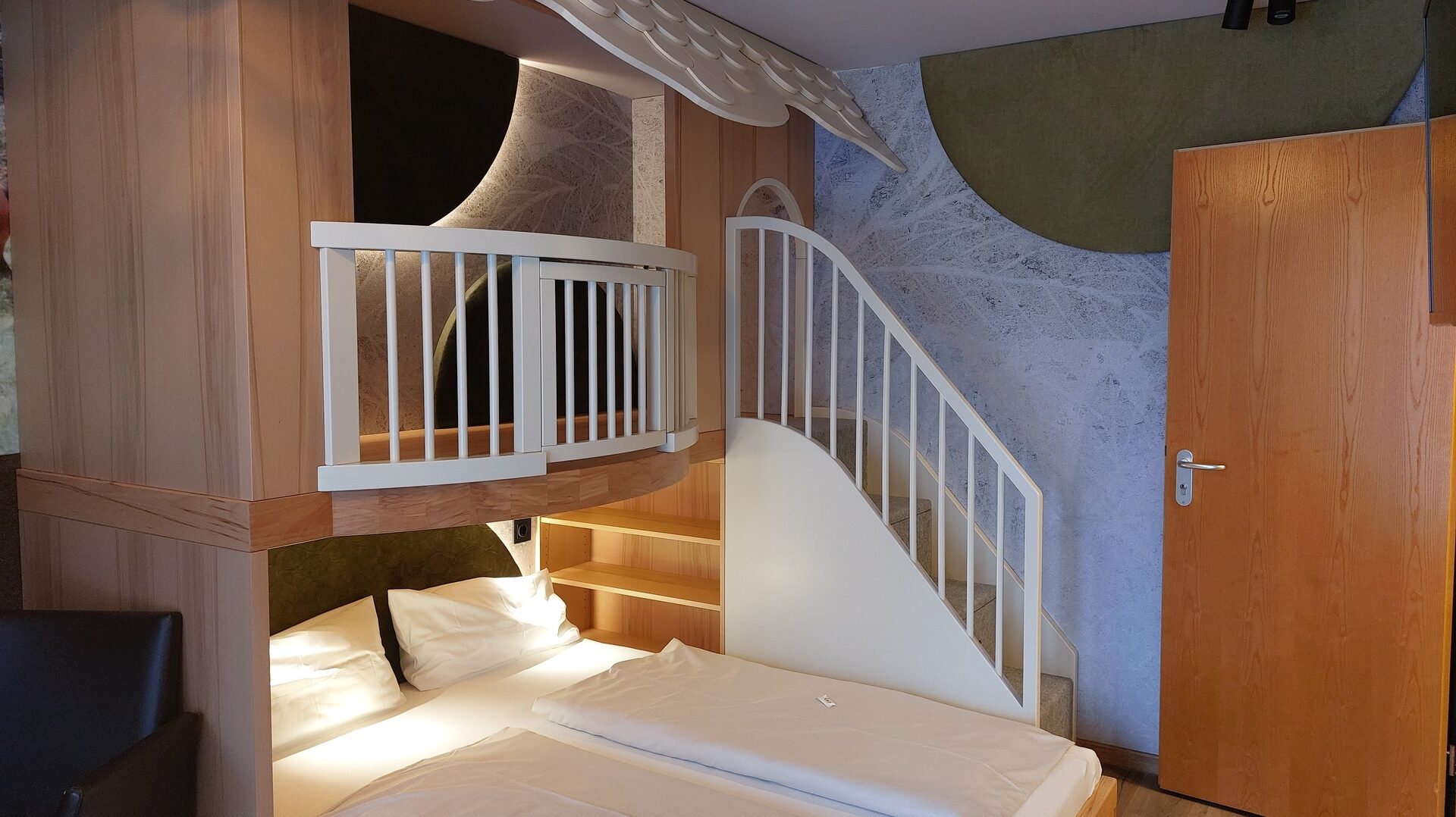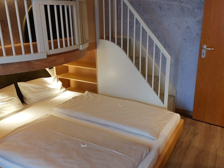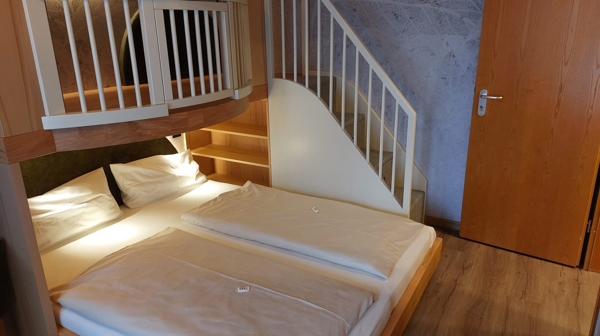 Bei 2 Zimmer dieser Kategorie (#100 & #200) gibt es im Kinderzimmer statt Hochbett/Querbett ein ein Doppelbett mit Spielhaus. Diese haben eine Dachterrasse oder Balkon (2.Stock) zum ruhigen Garten und verfügen über 2 Bäder (Elternschlafzimmer & Kinderschlafzimmer).