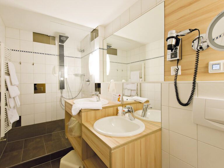 Zwei helle, gleich große Zimmer mit Verbindungsflur. Im Elternzimmer steht ein Doppelbett, im Kinderzimmer ein Hochbett und eine Schlafcouch. Ein Gitterbett ist in beiden Zimmern zustellbar. Zum Teil auch ein Bällebad im Kinderzimmer. Allergikerfreundlicher Eichen-Vollholz-Dielenboden. Das Badezimmer mit zusätzlichem Kinderwaschbecken ist von beiden Zimmern aus begehbar.