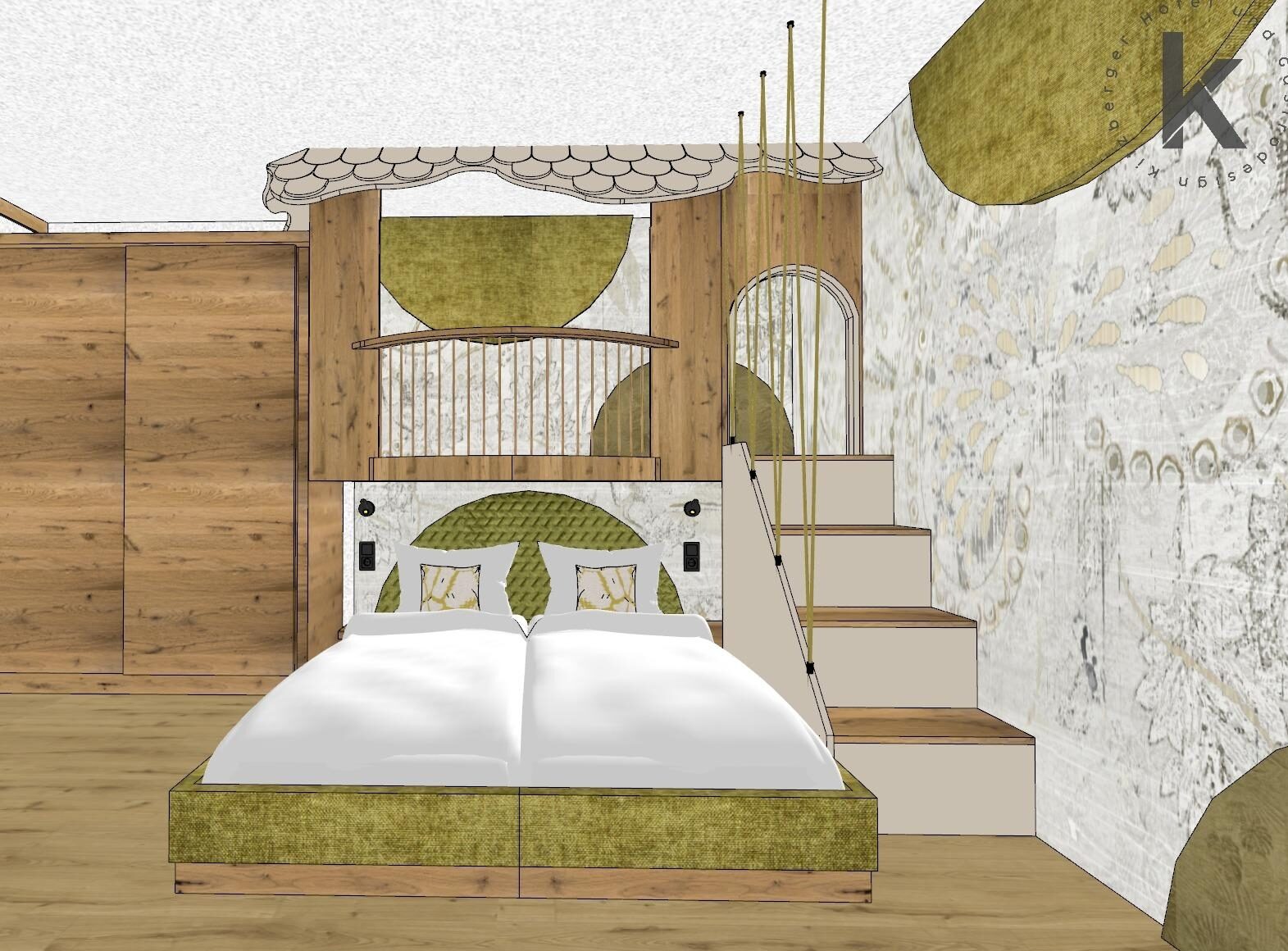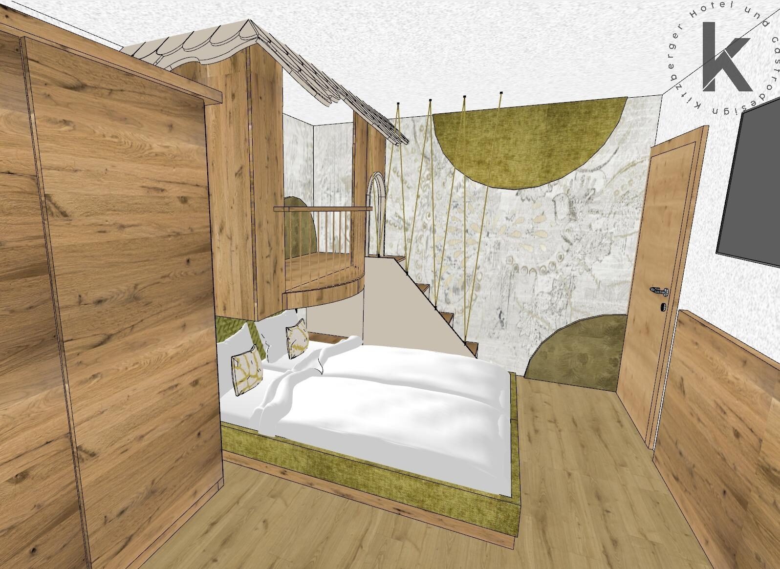 Bei 2 Zimmer dieser Kategorie (#100 & #200) gibt es im Kinderzimmer statt Hochbett/Querbett ein ein Doppelbett mit Spielhaus. Diese beiden Zimmer liegen zum Garten (Südseite) und verfügen über 2 Bäder (Elternschlafzimmer & Kinderschlafzimmer)
