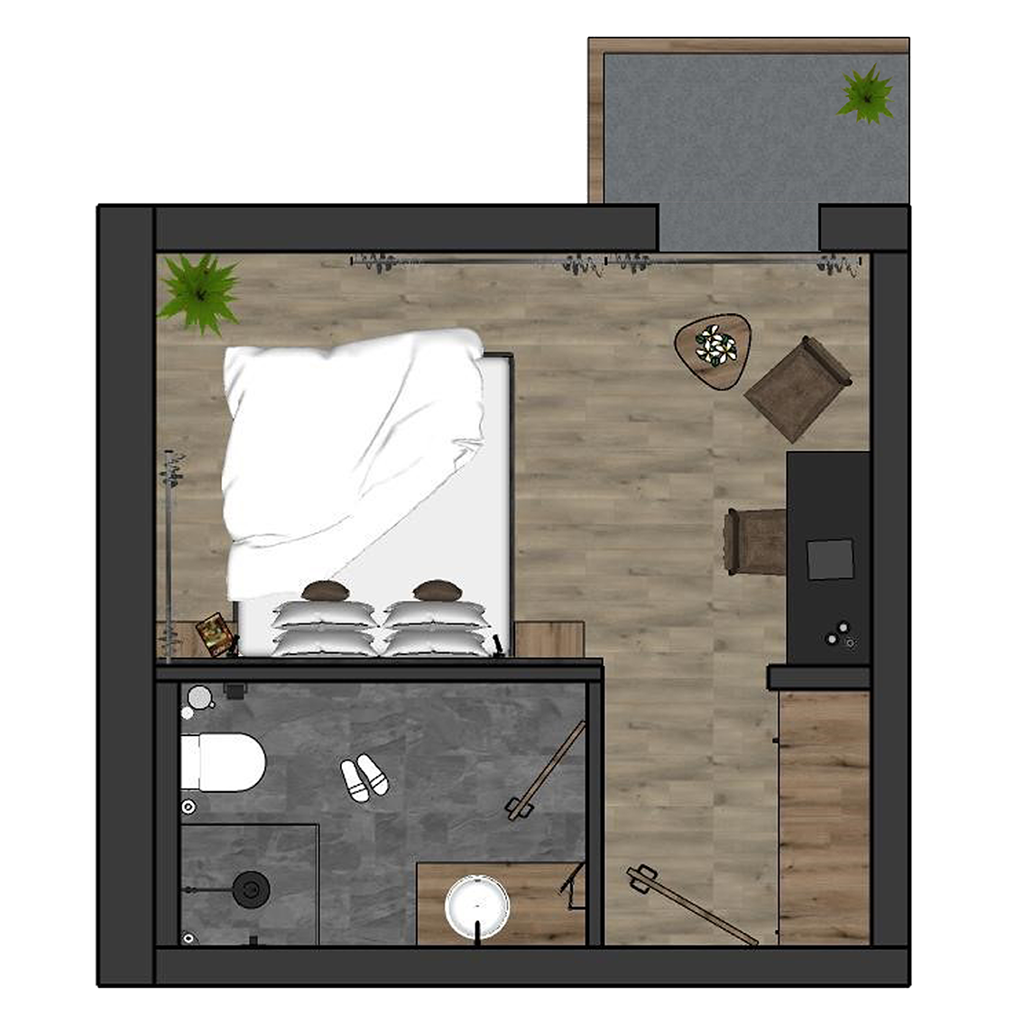 - Doppelzimmer-Variante (1x mit Balkon und 1x ohne) mit Doppelbett (1,80m x 2,00m) und eingehaustem Kinderbett mit Spielhaus